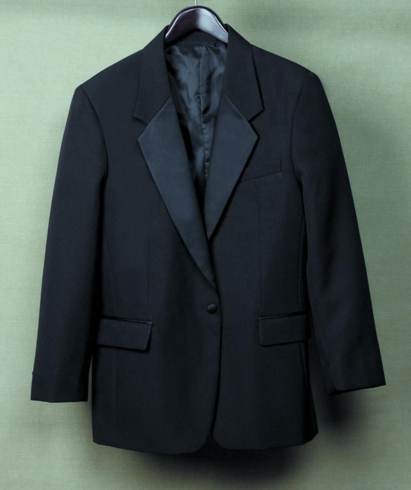 100% Polyester with satin nothch lapel, fully lined, center vent, and flap pockets.